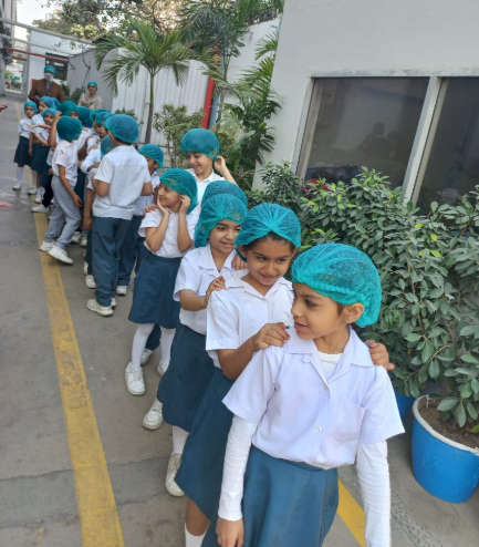 The students were welcomed by the EBM team and given a clear introduction to the factory, its products, and the importance of hygiene and safety in food production. As they moved through different sections of the factory, they observed each stage of biscuit-making—from mixing and kneading the ingredients to baking, packaging, and storage. Watching the process firsthand sparked curiosity, and the children eagerly asked thoughtful questions throughout the tour..